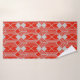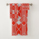 Este conjunto de toallas tiene un diseño Art Deco de formas diamantíferas y líneas en un campo de color rojo.
