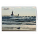 Una gaviota descansa en la playa mientras olas furiosas del lago Michigan chocan alrededor del muelle interior de St Joseph North y faros exteriores detrás. ¿Buscando más impresiones o productos? Siéntete libre de visitar mi tienda: http://www.zazzle.com/timelessmomentsphtgy Esta foto fue tomada por Jennifer White con Timeless Moments Photography. Todas las imágenes tienen derechos de autor © Timeless Moments Photography.