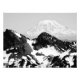 Fotografía en blanco y negro del monte Rainier con una cordillera accidentada en primer plano. Derechos reservados ©2023 Kimberly J Tilley. zazzle.com/store/developingnature
