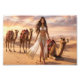 A captivating digital artwork featuring an elegant woman in flowing Middle Eastern-inspired attire walking confidently through golden desert sands accompanied by four camels during a breathtaking sunset, creating a fantasy adventure atmosphere.