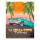 Afiche de viaje de La Jolla Cove California con un hermoso auto retro viejo, junto a altas palmeras balanceantes.