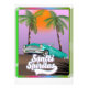 cartel de viaje de santiti espiritus Cuba, en un hermoso estilo retro, con puesta de sol y hermoso auto cubano viejo.