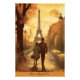 Poster de viaje de una pareja romántica que camina por París hacia la Torre Eifel mientras el sol se pone. Naranja cálido y colores amarillos.