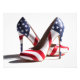 High-heeled shoes with a design inspired by the American flag are positioned against a plain white background