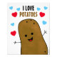 Patata marrón divertida y feliz rodeada de corazones de amor rojos y azules con 'Amo las Papas' en letras negras y marrones encima de su cabeza.