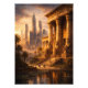 Step into a mesmerizing alternate reality with this fantasy wall art, where a colossal, columned Ancient Egyptian temple stands in harmony with a sprawling modern skyscraper skyline. Perfect for art lovers of all ages, this painting captures a retro-futuristic vision under a golden sunset, featuring pharaoh statues, palm trees, and a calm water lily pond. This unique blend of historical grandeur and architectural marvel will transform any modern living room, office, or study into a world of imagination and beauty. Available in multiple print sizes for a bespoke look.