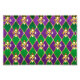 joyas, fondo del Mardi Gras de rhombus violeta y verde, lirios dorados decorados.