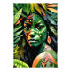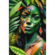"Arayúna" - Mujeres En La Amazonía. Su cuerpo, cubierto de intrincados patrones de pintura colorida, refleja el arte natural del bosque lluvioso. Es un lienzo vivo surrealista, su esencia tejida en el vibrante tapiz de lo salvaje. Ella se cautiva con una mirada de inquisitividad.