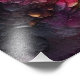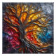 Retrato abstracto de un árbol marchitado sobre un fondo gris medio texturado. Las raíces, el maletero y las ramas se extienden en direcciones opuestas, infundidas con colores vibrantes: tonos de sangre roja, borgoña, azul, turquesa, naranja y amarillo. Las líneas abstractas en marrón dorado y oscuro crean una composición atractiva y artística, capturando la belleza dentro de la decadencia.