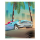 Automóvil verde de espuma marina retro con un paisaje urbano y palmeras.