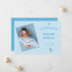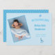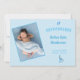 Tarjeta de Invitación para recién nacidos con foto azul de niño. El diseño de la tarjeta tiene una foto que usted reemplaza por la suya, además de una tierna jirafa, el nombre del bebé, la fecha de nacimiento y las estadísticas vitales. El fondo es azul con puntos blancos.