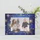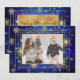 Copos de nieve dorados sobre un hermoso fondo azul. Tarjeta de felicitación de temporada. Triple marco dorado falso elegante. Agregue sus fotos familiares favoritas para personalizar esta belleza. Cambie los nombres y el año. Tan simple, pero chic.