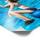 Un ilustracion digital presenta una vibrante escena tropical con una mujer, un barco y varios elementos de la naturaleza. La mujer, que parece ser caucásica con piel clara y pelo castaño, tiene unos 25 años. Ella está sentada sobre una bola de ejercicio azul en el agua, usando un sostén deportivo gris y pantalones cortos negros. El agua es azul turquesa, clara y luminosa, que recuerda a una piscina que se extiende hasta el horizonte y se funde perfectamente con el océano. Se ven palmeras y una vegetación exuberante como telón de fondo, con un loro colorido encaramado en uno de los árboles. Una mariposa azul flauta en el cielo. En el agua hay una barca de madera con remos, aparentemente flotando. Detrás del barco salen del agua tres colas de ballenas, lo que añade un toque caprichoso a la escena. El cielo es azul claro con algunas nubes dispersas. El estilo general es caricaturista y vibrante, con colores vivos y líneas claras. La composición es equilibrada, con los diversos elementos dispuestos para crear un sentido de profundidad y armonía. La iluminación es luminosa e incluso agradable, lo que realza el ambiente alegre e idílico del lugar.