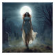 A woman in a flowing dress walks toward the viewer under a bright full moon in a graveyard, her hair lifted by the wind to create an ethereal effect