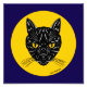 A retro-looking illustration of the face of a yellow-eyed black cat appears in a moon-like circle in this original Halloween-appropriate art by Richard H. Fay.