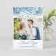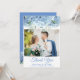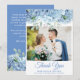 Foto boda tarjeta de agradecimiento con diseño floral azul periwinkle hidrangeas, flores de bonito con escritura elegante. nombres, fechas e información de personalizares.