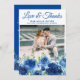 Foto boda tarjeta de agradecimiento con diseño floral azul marino, flores de bonito con escritura elegante. nombres, fechas e información de personalizares.