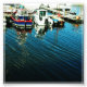 Un fotógrafo de barcos y boyas soleados en un puerto deportivo