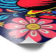 A golden Buddha statue is depicted in front of a vibrant backdrop of red and yellow splatters, creating a striking visual contrast. The serene expression on the Buddha's face adds a sense of peace amid the dynamic colors.