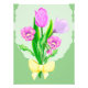 Montón de flores de primavera, tulipanes y panecillos atados con cinta amarilla. También un hermoso poster.