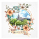 A panoramic illustration of Buzet, perched on a hill above the Mirna River valley, is framed by a rich floral border symbolizing Istria’s natural beauty and calm atmosphere. The decorative banner featuring the town’s name highlights its historical charm and romantic character. This design blends architecture, nature, and tradition into a decorative, souvenir-style illustration.