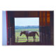 "Caballo en un establo, Missouri" por Catherine Sherman. Un caballo se levanta en una puerta de establo abierta en una granja en el oeste de Misuri.