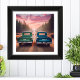 Camiones de los años 60 conduciendo por un camino de tierra roja juntos a través de verdes bosques de pinos con un cielo rosado al fondo. El camión izquierdo es kelly green, la derecha es real azul. Añadir nombres personalizados a los portaobjetos usando nuestra plantilla!
