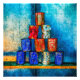 Pirámide de diez latas vacías de sopa de colores blanco, azul y rojo contra la pared metalizado de grunge. Algunas latas son rodadas. Fotografía estilizada y texturada.