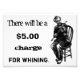 Este producto puede colocarse en un marco y mostrarse adecuadamente. Las palabras impresas en negro en el lado izquierdo son: Habrá un cargo de $5.00 por quejarse. Nadie quiere estar por ahí llorando a la gente cuando tenemos tanto que estar contentos de ir a nuestro alrededor. También hay un boceto de un violinista sentado en una silla del lado derecho, que asocia el llanto con la melodía del violinista.