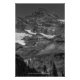 Fotografía en blanco y negro del Pequeño Tahoma con manchas de nieve dispersas por todo el lugar. Esta es una montaña ubicada en el Parque Nacional Mount Rainier, estado de Washington. En el borde de la sombra en la esquina izquierda está Fairy Falls. Y hay algunos árboles en primer plano. Derechos reservados ©2023 Kimberly J Tilley. zazzle.com/store/developingnature