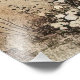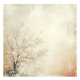 A delicate tree with soft, muted blossoms extends to the left, while a solitary bird flies in the pale, expansive sky. The composition evokes a serene and tranquil atmosphere, with a minimalist approach.