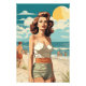 La imagen es una poster de estilo pop-art que representa una escena de playa veraniega de los años 50. Una mujer segura de sí misma con voluminosos cabellos ondulados, vestida con un elegante traje de baño blanco y naranja, se destaca en primer plano. Como telón de fondo, otros bañistas practican diferentes actividades a lo largo de la orilla, con un sol brillante en un cielo azul salpicado de nubes. La estética general combina la moda retro con un ambiente animado y nostálgico.