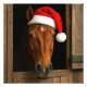 A horse wears a red Santa hat as it peeks out from a wooden stable, its warm tones beautifully contrasting with the festive colors.