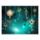 El oro, las llaves antiguas con engranajes y diales cuelgan de las cadenas de oro sobre un fondo verde luminoso.