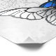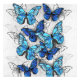 Composición vertical de mariposas morfo realistas, azules y blancas sobre fondo texturado gris. Mariposa morfo azul.