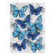 Composición vertical de mariposas morfo realistas, azules y blancas sobre fondo texturado gris. Mariposa morfo azul.