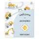 Construcción moderna Signo de bienvenida al primer cumpleaños en moderno y gris, símbolo de bienvenida de la construcción amarillo con tema de primer cumpleaños con cinco vehículos de construcción, camino gris y un cartel amarillo. Este signo de cumpleaños de construcción podría usarse para cualquier edad ya que la edad es editable.