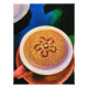 Representación vibrante y creativa de un capuchino. El diseño de espuma floral complementa el fondo luminoso y colorido, que evoca el calor y el estilo artístico.
