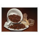 Envíe un saludo con esta fotografía de una taza de café y un platillo blanco con granos de café derramados.