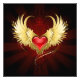 Corazón rojo brillante de un ángel con alas doradas brillando en el fondo rojo oscuro y radiante decorado con un patrón.