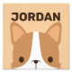 Este diseño presenta una ilustración de dibujos animados de un pequeño perro corgi con un nombre personalizado en estilo de fuente sans serif moderna marrón sobre fondo marrón claro.