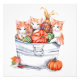 Diseño artístico de la cosecha de otoño - gatitos naranjas de mesa en una cesta con maíz, calabazas y calabazas.