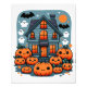 Impresión divertida de Halloween con un encantador ilustracion de Halloween que muestra una casa caprichosa y llena de ventanas naranjas, rodeada de calabazas sonrientes. Fantasmas amistosos flotan en el cielo nocturno mientras los murciélagos agregan un toque de diversión espeluznante. La divertida mezcla de miedosos y adorables capta la alegría de la temporada de trucos o dulces. Un diseño festivo para los amantes de la magia de Halloween.