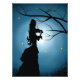 Una silueta de una dama con cabello largo y fluido y un vestido victoriano con cola, tocando un violín. Toca contra un cielo nocturno, en el fondo un árbol invernal desnudo y la luna brillando intensamente. Bailando alrededor de ella hay luciérnagas o quizás podrían ser hadas.