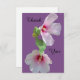 Foto de dos delicadas flores de hibisco rosa en una tarjeta de agradecimiento en blanco