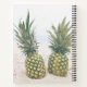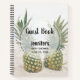 Un cuaderno de cartón espiral con una fotografía con un par de piñas sentadas en una playa de arena.