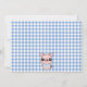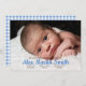Este diseño presenta un lugar para la foto de su bebé y detalles de su nacimiento. La parte trasera tiene un bonito lechón rodeado de gingham azul.