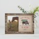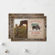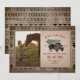 Ilustración de un bisonte que lleva un sombrero de Santa con un árbol de Navidad cubierto de nieve atado a su espalda. El borde y el reverso tienen un diseño geométrico inspirado en la tela de saco. Personaliza con la foto de tu familia.