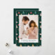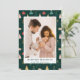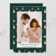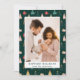 Envíe saludos de vacaciones a sus seres queridos con estilo con nuestra tarjeta fotográfica de Navidad moderna dibujada a mano. La tarjeta de saludo de vacaciones muestra tu foto enmarcada en blanco con un patrón de árboles de Navidad dibujados a mano y regalos en una paleta de colores de verde, verde azulado, rosa, dorado y rojo. Personalice el frente agregando un saludo personalizado y sus nombres. La tarjeta se revierte a un fondo verde de bosque sólido con espacio para un mensaje personalizado u otra foto.