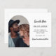 Una foto Guardar la tarjeta de fecha para su boda. En el frente: Añade tu propia foto de tamaño vertical dentro del marco de la foto del arco. Fondo blanco de moda, texto negro. Plantillas para nombres y fecha. El nombre y el texto: Guardar la fecha se escriben con un guión de estilo con letras a mano moderno. Atrás: puede agregar más texto si lo desea. Vaya a la herramienta de diseño y agregue la capa posterior. 1 hoja = 1 Guardar el borde impreso de fecha en borde.